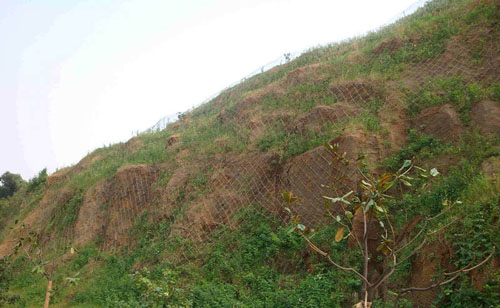鋼柱+支撐繩+拉錨繩+縫合繩+減壓環(huán)[鋼柱( 間距10M),帶消能環(huán)的∮14雙支撐繩和∮16“1”字形上拉錨繩(每跨3個消能環(huán)),∮14側(cè)拉錨繩(單繩),◇/08/250/4*5㎡鋼絲繩網(wǎng),∮8縫合繩,格柵網(wǎng)]